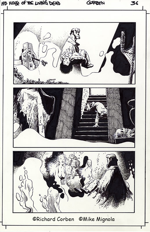 Richard Corben’s comic page drawing of Hellboy, House of the Living Dead, page 36. Pen, ink and markers.