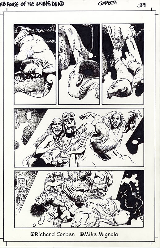 Richard Corben’s comic page drawing of Hellboy, House of the Living Dead, page 39. Pen, ink and markers.
