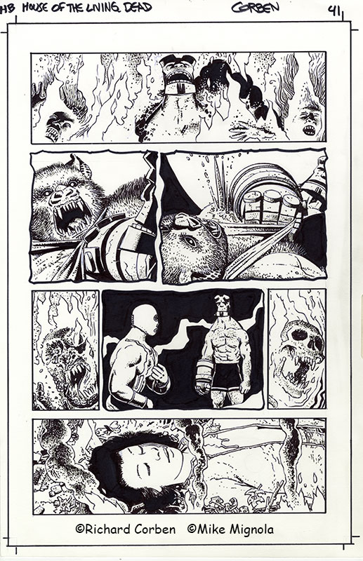 Richard Corben’s comic page drawing of Hellboy, House of the Living Dead, page 41. Pen, ink and markers.